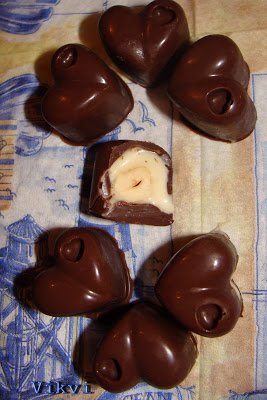A hétvégén, elkészítettem a Knoppers házi változatát. Elég jól sikerült, de a fehér krém kicsit folyós lett, még nem az igazi, de ha majd szép képet csinálok róla felteszem. Ebből a fehér krémből, elég sok maradt és +1 nap hűtőben csücsülés után, elég jó sűrű krémet kaptam. Úgy egy jó fél bögrényi krémem volt még. Hát mit tehet ilyenkor egy lány? Bonbonba rakja 🙂 Mert most már kétfelé jár az agyam, egyik fele süt, a másik azon gondolkozik milyen bonbont lehetne kihozni ebből? De jól sikerült, mivel a Knoppersben mogyoró és csoki is van adott volt, a burok az tejcsoki volt, és rejtettem a közepébe egy szép szem pörkölt mogyorót. Nagyon finom volt, csak azt sajnálom utólag, hogy nem tettem bele egy kis darab ostyát, még jobb íze lett volna Na nem baj majd legközelebb ha ilyet készítek teszek bele 🙂