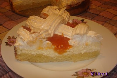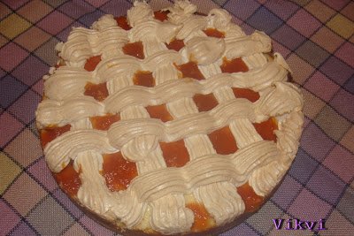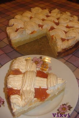 Összegyúrom a hozzávalókat, majd egy kivajazott, kilisztezett, tortaformába nyomkodom. Megszurkálom egy villával, jó sűrűn. Majd elősütöm, 180 fokon, kb. 10-13 percig. Ezalatt az idő alatt elkészítem a túrótölteléket. Ez nagyon egyszerű, mert csak egy tálba teszem a hozzávalókat és robotgéppel szépen eldolgozom. Mikor elősült a tészta, rákenem a tölteléket, és visszateszem 20-25 percre. Amikor már majd nem megsült előveszem a tojásfehérjéket, felverem őket, majd fokozatosan hozzáadom a cukrot és tovább verem, míg jó kemény nem lesz, habcsókos. Beletöltöm egy habzsákba (csillagcsővel) és a még forró tortára nyomom. Kedvünk szerint, én a hagyományos rácsos mintát szeretem ennél a sütinél. Visszateszem a sütőbe és szikkasztom (150 fokon) amíg kemény nem lesz a hab, úgy szeretem, ha kicsit barna. Ha kész akkor a réseket, megtöltöm, házi sárgabarack lekvárral. Kicsit hűlni hagyom, és már lehet is enni 🙂