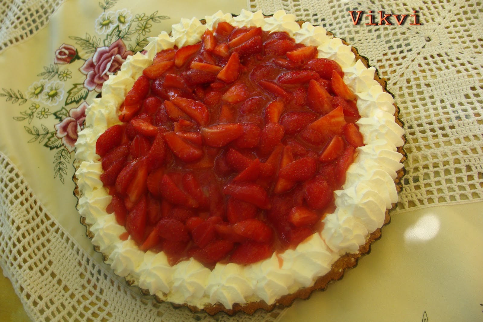 Felvertem a tetejére tejszínhabot 1,5 dl. Habzsákba töltöttem, és szorosan egymás mellé rózsákat nyomtam. Azért fontos hogy egymás mellett legyenek mert így nem folyik le a máz a pite oldalára. Mikor végeztem belehalmoztam az epret. Visszatettem a hűtőbe kicsit, de csak azért mert a gyerekek épp aludtak, a férjem meg dolgozott. de azonnal is fogyasztható.