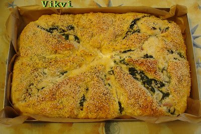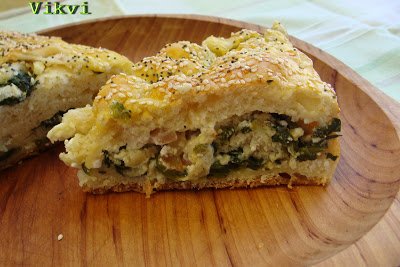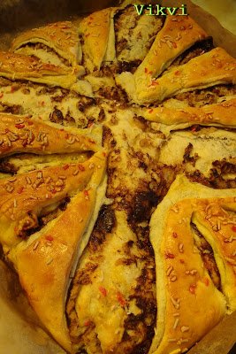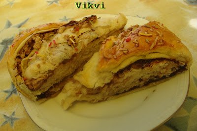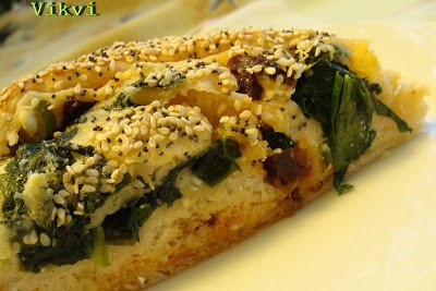 Az egyik gombócot szép vékonyra kinyújtom, téglalap alakúra. Ezt lekenem a vajjal. Egy másik deszkán kinyújtom a második gombócot ugyanakkorára, ráteszem az előzőre. Megkenem vékonyan vajjal. Majd rárakom a medvehagymát, a kolbászt és a túrót. Ezután kinyújtom a harmadikat, ráteszem a töltelékre, és lekenem megint vajjal. Elkezdem a hajtogatást. Felülről is hajtok meg alulról is hogy középen találkozzanak, majd ugyanígy a két oldaláról. Megfordítom és egy sütőpapíros tepsire teszem. Bevagdosom a tetejét. 1 órát hagyom kelni. Lekenem tojással és megszórom valamilyen maggal, én most mákkal és szezámmaggal. 180 fokon sütöm 30-40 percig.