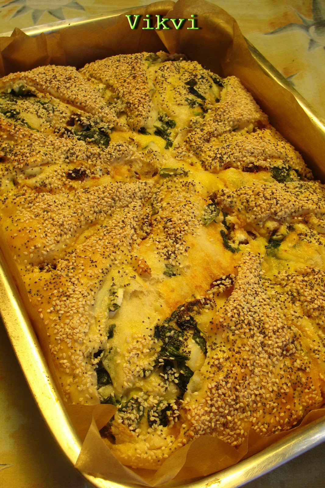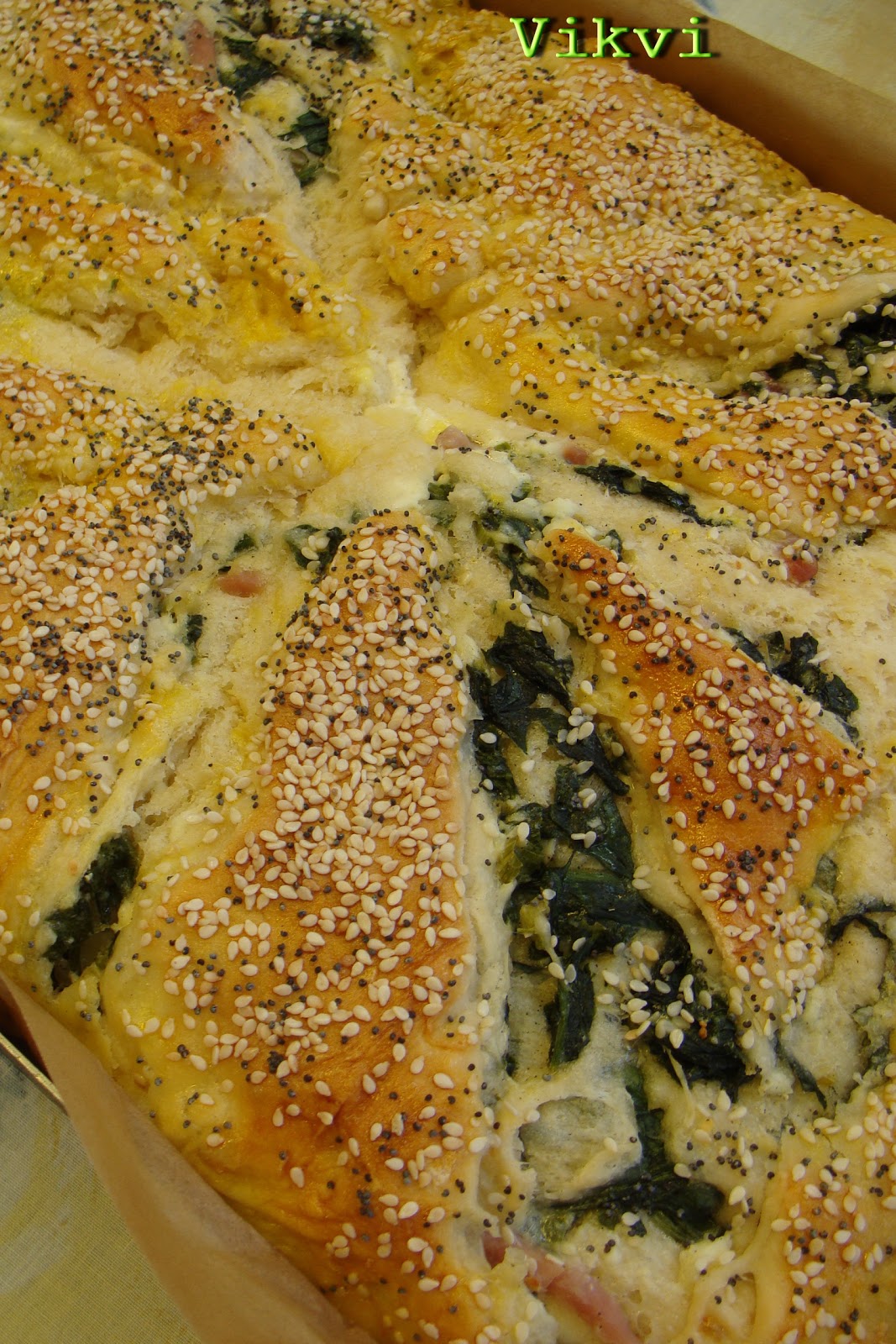 Az egyik gombócot szép vékonyra kinyújtom, téglalap alakúra. Ezt lekenem a vajjal. Egy másik deszkán kinyújtom a második gombócot ugyanakkorára, ráteszem az előzőre. Megkenem vékonyan vajjal. Majd rárakom a medvehagymát, a kolbászt és a túrót. Ezután kinyújtom a harmadikat, ráteszem a töltelékre, és lekenem megint vajjal. Elkezdem a hajtogatást. Felülről is hajtok meg alulról is hogy középen találkozzanak, majd ugyanígy a két oldaláról. Megfordítom és egy sütőpapíros tepsire teszem. Bevagdosom a tetejét. 1 órát hagyom kelni. Lekenem tojással és megszórom valamilyen maggal, én most mákkal és szezámmaggal. 180 fokon sütöm 30-40 percig.