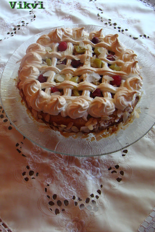 A maradék rebarbarát, puhára főzöm 2 dkg cukorral. 2 tojás fehérjét, felverek citromlével és a maradék cukorral és a mézzel. Kemény hab legyen. Kiveszem a tortát a sütőből, én levettem a kapcsos forma oldalát. A habot habzsákba tettem és kidíszítettem a tortát. Majd még 15 percre visszatettem a sütőbe. Leemeltem a tortaforma aljáról és egy tortatálra tettem. Az oldalát bekentem a lekvárral majd hozzá tapasztottam a mandulát, valamint egy kevés kókuszszirmot.