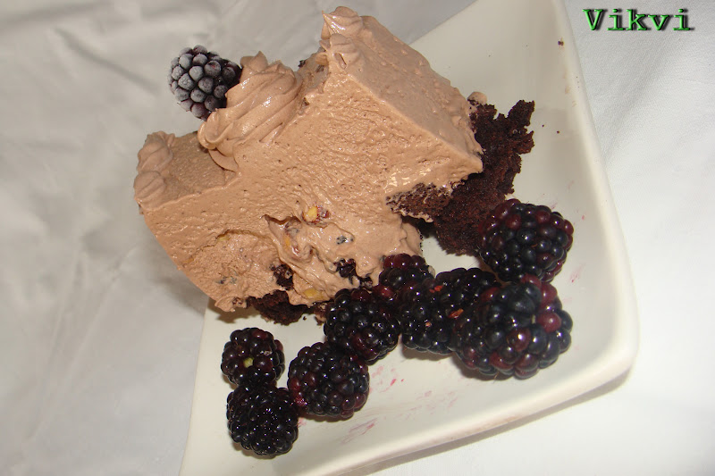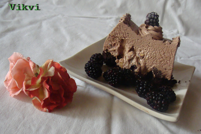 A krémhez előző este a tejszínt felforralom és beletördelem a csokoládékat. Simára keverem és miután kihűlt lefóliázom és egy éjszakára a hűtőbe teszem. Másnak felverem laza habbá. A tojássárgákat kikeverem kevés cukorral, felverem a fehérjét és összeforgatom a kettőt, majd a csokikrémmel forgatom össze. Kifóliázok egy kenyérsütő formát majd lerétegezem a krémet. Krém, majd ezt megszórom mogyoróval. Megint krém egy réteg szedet, majd újra krém. Végül a piskóta darabok az aljára. Minden réteg között beteszem kicsit a fagyasztóba. Végül 3-4 óra elteltével kifordítom egy tálra, lehúzom róla a fóliát és kedvem szerint díszítem. Azt szeretem benne a legjobban, hogy bármennyit is van a fagyasztóban sosem fagy kő keményre.