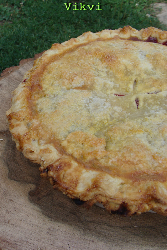 Lisztezett deszkán kinyújtom, majd a piteformába teszem. Erre megy a töltelék, a töltelék tetejére, néhány darabka vaj, majd a másik tészta. Összenyomkodom a két oldalt, vágok a tetején néhány légnyílást, hogy a gőz távozni tudjon. Lekenem tojással és megszórom cukorral. És 200 fokon sütöm 10 percig, majd lentebb veszem 180 fokra és sütöm még 40 percet. Ha nagyon sülne a teteje, lefedem alufóliával.