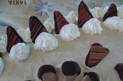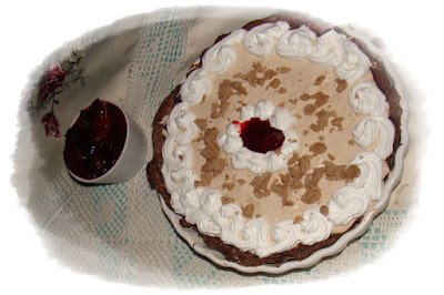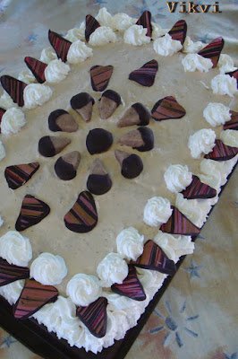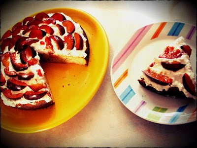 A pite tésztát hagyom kihűlni, majd megkenem egy tábla olvasztott étcsokival. Ha ez megszilárdul belemehet a krém fele. Egy réteg vaníliás tejbe forgatott – épp csak belerakom és már veszem is ki – babapiskóta. Rá a másik réteg krém. Majd tejszínnel díszítem és rumos szilva ragut is adok hozzá aki kér.