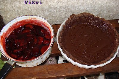 A liszthez hozzáadom a sót és a cukrot, a kakaót majd elmorzsolom vele a vajat. Apránként hozzáadom a hideg vizet, és tésztát gyúrok belőle. De nem gyömöszkélem sokáig, mert akkor lesz finom omlós ha rövid ideig gyúrom, gyorsan összeáll. 1 órára a hűtőbe, teszem. Majd lisztezett deszkán kinyújtom, és a kivajazott formába teszem. 200 fokon sütöm, vaksütéssel 10 percig majd még 10 -12 percig, miután kivettem a nehezéket. Hagyom kihűlni.
