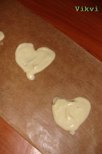 10 dkg fehér csokoládét, olvasztottam úgy, hogy temperáltam előtte, így nem folyik szét annyira a díszítés. Vagyis 7 dkg fehér csokit megolvasztottam, majd hozzáadtam a maradék hármat és addig kevergettem amíg le nem hűlt 28 fokosra, majd visszamelegítettem 30 – 31 fokra. Sütőpapírból tölcsért készítettem, beletöltöttem a csokit és szíveket nyomtam ki belőle. Ezt hagytam teljesen megszilárdulni.