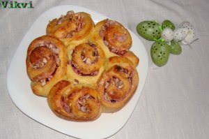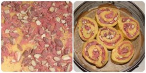 Még egyszer kinyújtom, megszórom az aprított pralinéval, és feltekerem. A két végét nem kell behajtani. 6 tekercsre vágom. 24 cm-es tortaformát kibélelem sütőpapírral. Majd beleteszem a tekercseket, úgy, hogy olvasztott vajjal megkenem, a tekercsek oldalát. Hagyom még egy 15 percet kelni, lekenem tojással, majd a sütőbe teszem kb. 30 percre. Miután megsült eltávolítom a formát. Szépen foszlik, amikor szétszedem a tekercseket. Finom lágy a kalács, jó ropogós a praliné, nagyon jók együtt.