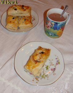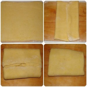 Az élesztőt felfuttatom a meleg tejben, előtte hozzáadtam a cukrot és a sót. Tálba teszem a lisztet, hozzáöntöm, az élesztőt, majd egyenként hozzágyúrom a tojásokat. Végül, a puha vajat hozzádolgozom. Jó rugalmas tésztát kell kapjak, ha nem elég rugalmas akkor lazítom langyos tejjel, bár én az eredeti recepthez képest több tejet adtam meg, mert nekem ennyit felvett. Meleg helyen 2 órát kelesztem, majd a hűtőbe teszem. 1 éjszakát állni hagyom. A tálat amibe van, mindenképp le kell fedni, alufóliával, vagy akár egy fedővel. Tehát, miután kb 10 órát hűtőzött a tészta, kiveszem és hagyom melegedni úgy 15-20 percet. Ekkor már bekapcsolom, a sütőt 180 fokra. Lisztezett deszkán kinyújtom, a tésztát, majd elkezdem hajtogatni. A két oldalát behajtom, majd az alját és a tetejét is. Megfordítom és újra nyújtom. A menetét, lásd a fotón. Ezt megismétlem 4- szer. Nem kell szünetet tartani, a hajtogatások között.