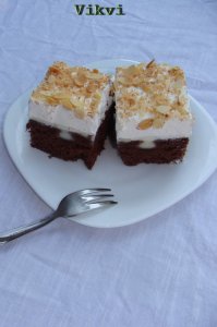 Egy száraz serpenyőbe öntök, kókuszreszeléket, és szép arany barnásra pirítom, egy tányérba teszem hűlni. Majd a mandula szeleteket is megpirítom, az is mehet mellé. Ha teljesen kihűlt megszórom a sütit. Hűtőbe teszem és 10 perc múlva már szeletelhetem is.