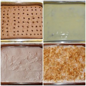 Nemrég felfedeztem a bökött sütiket. Vagyis hivatalosan poke cake-nek nevezik. Lényege az hogy a piskótát, meg szúrkálom villával vagy fakanál nyelével – utóbbival persze látványosabb – ráöntöm a pudingot, vagy karamell krémet. Az szépen belecsorog a lyukakba és a süti tetejét is lefedi. He kihűlt rámegy egy réteg tejszín, majd valami ropogós a tetejére. Lehet az keksz morzsa, csokidarabok, vagy akár mandulaszeletek és pirított kókusz mint nálam. Nagyon finom, egyszerű és mutatós süti. Gyakorlatilag a végtelenségig variálható és gyorsan kész.