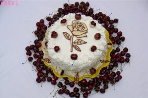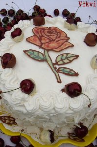 Piskóta torta cseresznyés krémmel és rózsával díszítve: