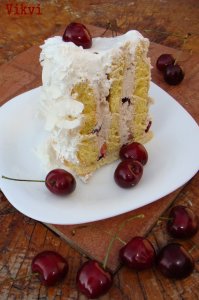 A kapcsos torta formát, összerakom. Az aljába, beleteszem az omlós lapot. A 6 piskóta csíkot lekenem a krémmel. Majd elkezdem az egyik csíkot feltekerni. Egy csigát kapok. Ezt az omlós tészta közepére teszem. Folytatólagosan, rátekerem a maradék piskóta csíkokat. Ez kiad egy 26 cm-es tortát. Kicsit a hűtőbe teszem dermedni. Majd leveszem a torta formát. Gond nélkül, átemeltem az alsó részről is, egy tálcára. 3 dl felvert tejszínhabbal díszítem, valamint az oldalára kókusz chipszet tapasztottam. Ez biztosan jobban mutat, egy sötét tortán. Viszont a cseresznye – kókusz párosa isteni. Csokoládéból díszt készítettem a tetejére.