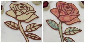 A csokoládét, megolvasztom és temperálom. 2/3 részét megolvasztom, majd az 1/3 részét hozzákeverem. Addig keverem amíg 28 fokos nem lesz. Felmelegítem 30 fokra. Zacskóba töltöm, kivágom az egyik csücskét . Majd a Sablonra sütőpapírt teszek, és átrajzolom a sötét csokival a rózsát. Beteszem a hűtőbe. Megtemperálom a fehér csokit is, majd kitöltöm a réseke, szintén egy zacskó segítségével. Megint hűtőbe teszem. Mikor teljesen megdermedt, óvatosan a tortára teszem.