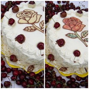 Süni egy szuper témával kedveskedett nekünk a SAD 16 fordulójára. Díszíts rózsával! Már amikor elolvastam a kiírást akkor tudtam, hogy Anyukám szülinapi tortáját, fogom díszíteni vele. először, marcipánból akartam, rózsát készíteni. Majd csokigyurmából. Először málnából akartam, aztán kaptunk rengeteg cseresznyét, így abból készült. Végül a díszítést, az döntötte, el hogy a fiúknak keresgéltem a neten színezőket és megláttam itt a rózsákat. Végül csokiból készült a dísz. Meg is színeztem egy kicsit lüszter festékkel.