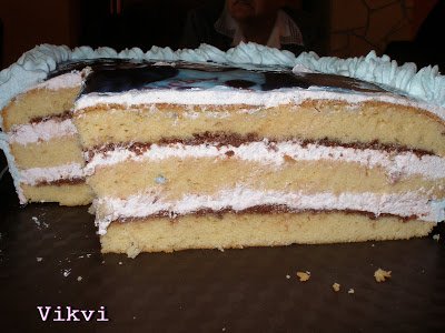 Úgy töltöttem meg, hogy az alsó lap mogyorókrémes felére, kentem egy réteg joghurtos krémet, majd a középső piskótát raktam rá. Ezt is megkentem a joghurtos krémmel, a felső piskótát pedig úgy helyeztem el hogy a mogyorókrémes fele érje a tejszínes krémet. Kívülről, bevontam a világoskék tejszínhabbal. Elhelyeztem az ostyaképet, majd körben is kidíszítettem.