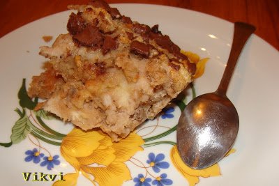 A jénait kivajazom és félreteszem. A kifliket felkarikázom és egy nagy tálba teszem. 1 liter tejet felmelegítek, lehet bele tenni vaníliát is. A tojásokat ketté választom a sárgáját kikeverem a cukorral. Majd öntök hozzá a tejből. A kiflikre öntöm a tejet elkeverem, majd a sárgájás cukros tejet is rálocsolom. Hozzáadom a kétféle diót. Felverem a fehérjét és óvatosan hozzáforgatom. Megszórom a csokival. Közepesen meleg sütőben sütöm, 25-30 percig. akkor jó ha szépen feljön. Hagyjuk a sütőben hűlni és akkor nem fog összeesni.